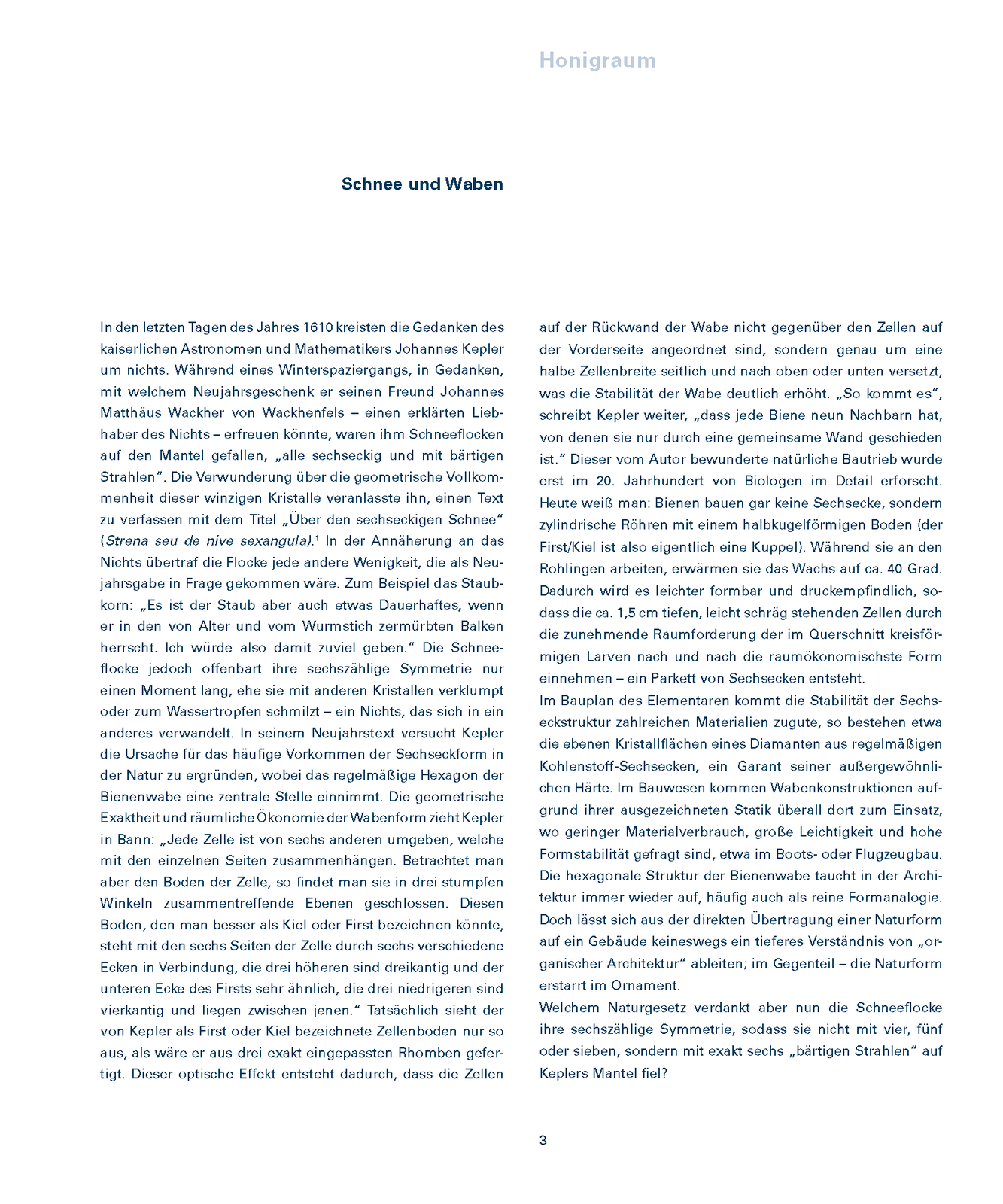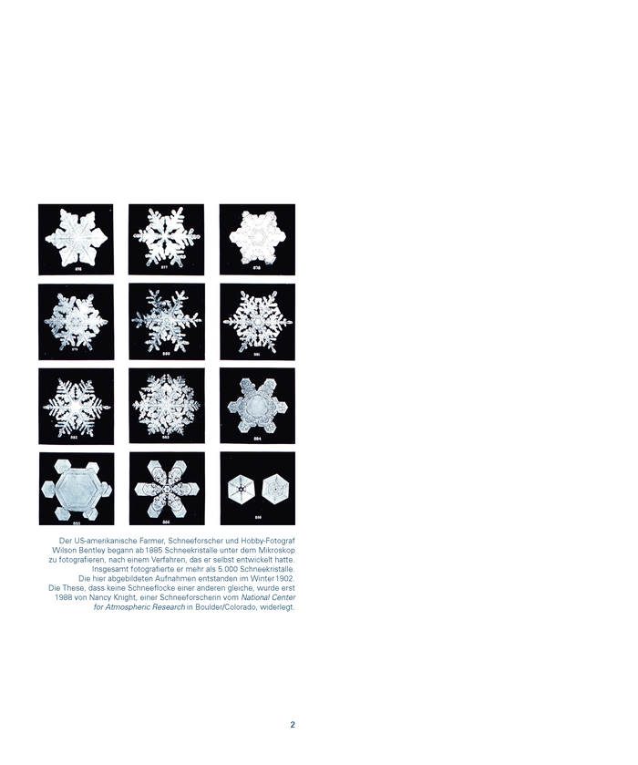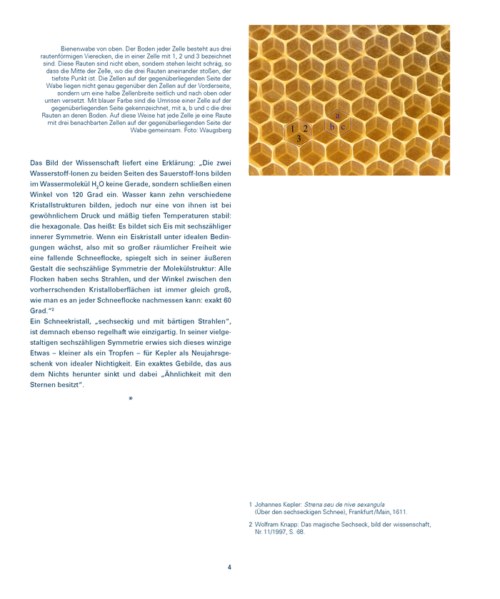 PublikationIn den letzten Tagen des Jahres 1610 kreisten die Gedanken des kaiserlichen Astronomen und Mathematikers Johannes Kepler um nichts. Während eines Winterspaziergangs, in Gedanken, mit welchem Neujahrsgeschenk er seinen Freund Johannes Matthäus Wackher von Wackhenfels – einen erklärten Liebhaber des Nichts – erfreuen könnte, waren ihm Schneeflocken auf den Mantel gefallen, „alle sechseckig und mit bärtigen Strahlen“. Die Verwunderung über die geometrische Vollkommenheit dieser winzigen Kristalle veranlasste ihn, einen Text zu verfassen mit dem Titel „Über den sechseckigen Schnee“ (Strena seu de nive sexangula). In der Annäherung an das Nichts übertraf die Flocke jede andere Wenigkeit, die als Neujahrsgabe in Frage gekommen wäre. Zum Beispiel das Staubkorn: „Es ist der Staub aber auch etwas Dauerhaftes, wenn er in den von Alter und vom Wurmstich zermürbten Balken herrscht. Ich würde also damit zuviel geben.“ Die Schneeflocke jedoch offenbart ihre sechszählige Symmetrie nur einen Moment lang, ehe sie mit anderen Kristallen verklumpt oder zum Wassertropfen schmilzt – ein Nichts, das sich in ein anderes verwandelt. In seinem Neujahrstext versucht Kepler die Ursache für das häufige Vorkommen der Sechseckform in der Natur zu ergründen, wobei das regelmäßige Hexagon der Bienenwabe eine zentrale Stelle einnimmt. .....