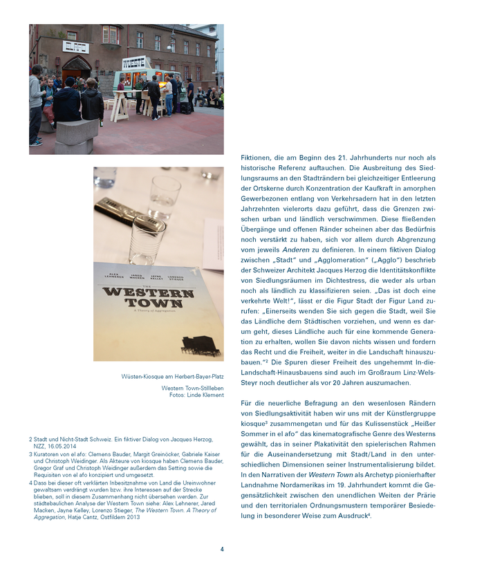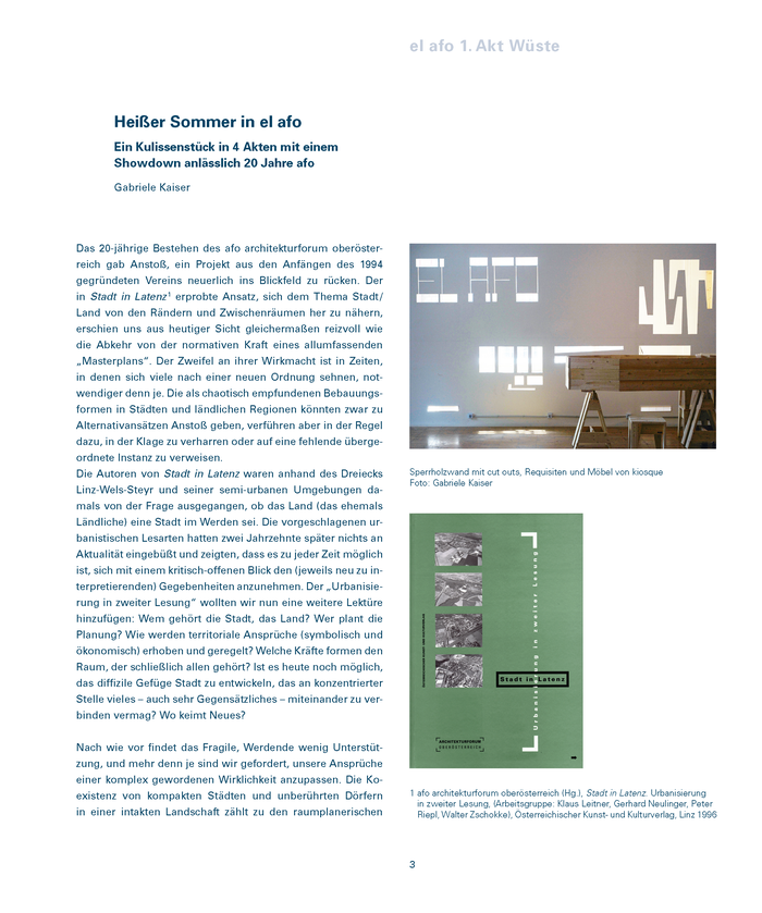 Das 20-jährige Bestehen des afo architekturforum oberösterreich gab Anstoß, ein Projekt aus den Anfängen des 1994 gegründeten Vereins neuerlich ins Blickfeld zu rücken. Der in Stadt in Latenz 1 erprobte Ansatz, sich dem Thema Stadt /Land von den Rändern und Zwischenräumen her zu nähern, erschien uns aus heutiger Sicht gleichermaßen reizvoll wie die Abkehr von der normativen Kraft eines allumfassenden „Masterplans“. Der Zweifel an ihrer Wirkmacht ist in Zeiten, in denen sich viele nach einer neuen Ordnung sehnen, notwendiger denn je. Die als chaotisch empfundenen Bebauungsformen in Städten und ländlichen Regionen könnten zwar zu Alternativansätzen Anstoß geben, verführen aber in der Regel dazu, in der Klage zu verharren oder auf eine fehlende übergeordnete Instanz zu verweisen.