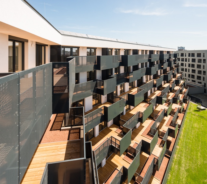 Die innere Gebäudefront öffnet sich Richtung Süden und ermöglicht so die ganztägige Besonnung der Wohnräume und der zugeordneten begrünten Freiräume. Verstärkt wird dieses Konzept durch eine terrassenförmige Staffelung des Baukörpers in Richtung Süden, zur „Grünen Mitte“ des Gesamtareals hin. Diese Typologie und die architektonische Gestaltung mit den signifikanten gestaffelten begrünten Terrassen findet ihren Ausdruck in der Wahl des Titels: „Zuhause auf dem Sonnendeck“.