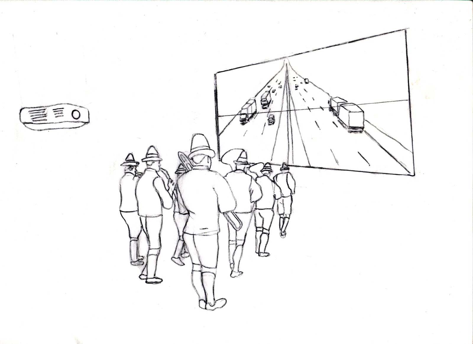 der vorbeibrausende Verkehr projiziert wird. Die Musikkapelle verwendet die Leinwand als Partitur, ihre Mitglieder spielen von ihr ab. Dabei wird jedes Fahrzeug zur Note, die Autobahn zum Notenblatt. Die Kapelle übersetzt den Verkehrslärm in Musik. Die Beschallung wird in Klang, die Lebensbelastung in Lebensfreude übersetzt.