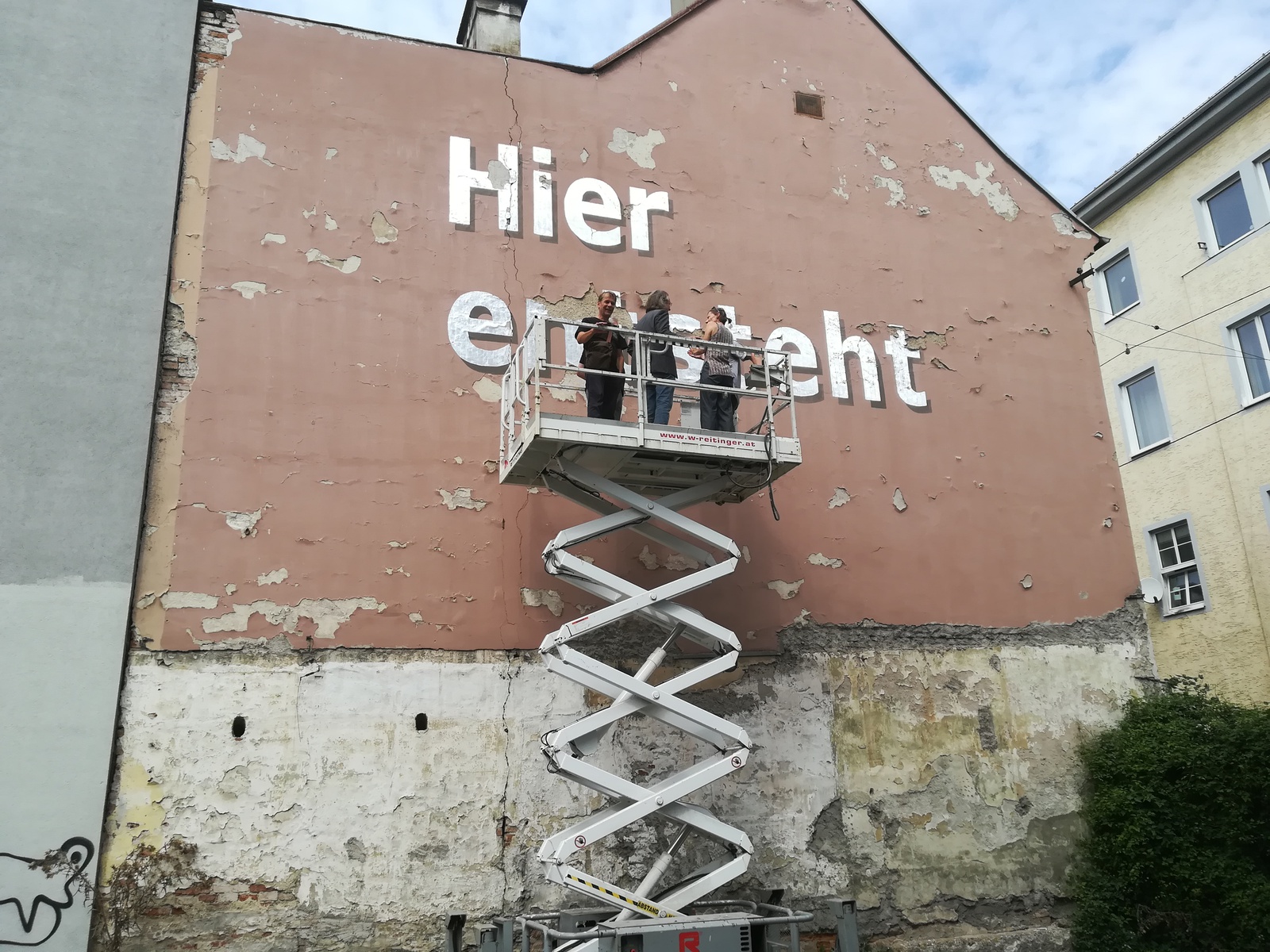 Andrea Böning arbeitet am Schriftzug "Hier entsteht" an der Mauer zwischen Graben und Kollegiumgasse. Diesen Freitag gibt es eine vor-Ort-Besichtigung und die Möglichkeit die Künstlerin zu treffen. Für Snacks und Drinks ist gesorgt.